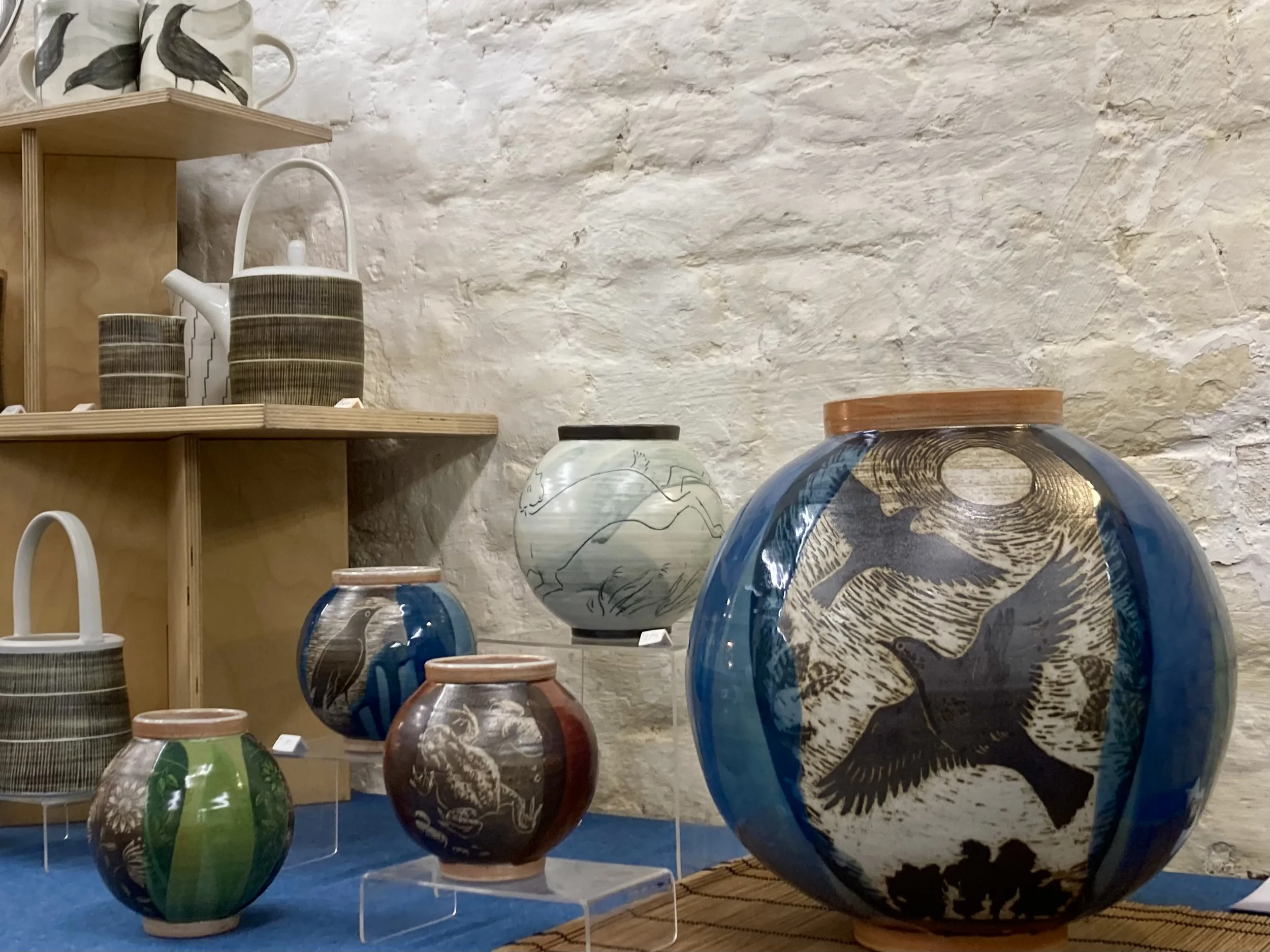 This year at 38 Winchester Street I am showing artist Charlotte Moreton’sbpaintings, prints and sculptures, inspired by coastal landscapes and wildlife, alongside my own work. Also, for the first time there will be a fabulous and richly varied collection of pieces on show made by the potters who have come along to join me for pottery sessions at the workshop over the past 20 years or so. A cornucopia of creativity!